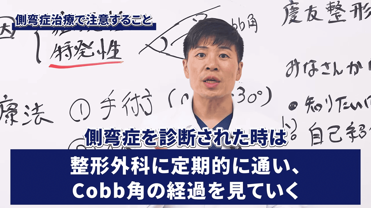 軽度の段階であっても、成長期のあいだは3〜6か月ごとの定期受診が勧められます。検査ではレントゲン撮影を行い、角度の変化を記録します。進行が見られた場合には、装具療法やリハビリなど保存療法への切り替えを検討します。また、成長スパート期はわずか数か月で進行するケースもあるため、特に注意が必要です。保護者が「見た目が少し変わった」と感じた時点で早めに受診することが大切です。成長が落ち着き、リッサーサインが5に達すれば進行のリスクはほとんどなくなります。